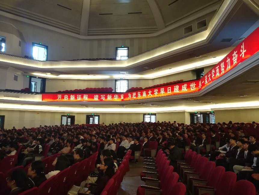 参观结束后,领导和老师与同学们在庄重的大礼堂进行交流。交流会伊始,在场师生一同观看了我校形象宣传视视频,同学们对学养深厚、学风严谨的百年东大有了更清晰的认识。随后倪庆剑老师从四个方面展开宣讲,分别介绍了东大的历史积淀,雄厚实力,以及东大学子丰富的学习生活,同时也对在座学生表达了期许,希望能在东大再次见到各位同学的身影。