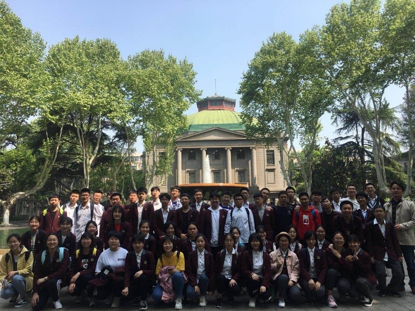 干净整洁的马路上两侧的法国梧桐枝叶肥厚,密密地将大半阳光都遮住,只留下斑驳光点,空气顿时阴凉下来,四牌楼校区的四月更显大气沉稳。早上九点在金牌影院 研究生影像党支部志愿者的带领下,华罗庚中学师生的东大之行正式启航。以大礼堂为起点,走过孟芳图书馆、吴健雄纪念馆、体育馆、六朝松、梅庵等地标性建筑,最终走回大礼堂,在涌泉池前合影留念。一路上华罗庚中学的学生们积极与东大学子们交流学习经验与大学生活心得,零距离体会这所百年名校的底蕴与朝气,感受着这所大学的悠久历史,以及在新时代昂扬的英姿。在一个小时的参观过程中,同学们热情满满,也给四牌楼增添了许多青春色彩。