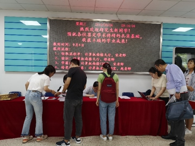 新生报到的各项事宜在计算机楼大厅有条不紊的进行,学院首先给每位新生发放了入学报到院系事务表,方便新生了解报到注册流程。尽管报到的同学很多,但在老师以及迎新志愿者的帮助下,整个报到流程从新生信息的校验、党组织关系办理到户口迁移材料收取等逗进行的井井有条。同时为帮助新生快速了解研究生守则和校园安全,老师们将校徽、研究生手册、安全手册和数模宣传册这些材料分发给新生。