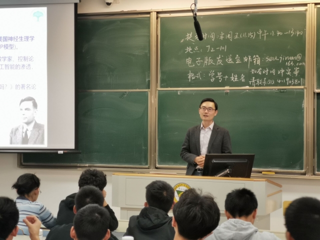 随后,耿老师介绍了人工智能的产生与发展,共包括5个时期,分别是孕育期(1956年前)、人工智能诞生(1956年)、推理期(1956——1960年代末)、知识期(1960年代末——1980年代末)和学习期(1980年代末——今)。图灵于1950年发表题为《计算机能思维吗?》的著名论文,论文中的“图灵测试”在现在也影响颇深。1956年的达特茅斯会议标志着人工智能这一学科的诞生。心理学小组、IBM工程小组、MIT小组在推理期各自发挥了自己的作用。知识期专家系统实现了人工智能从理论研究走向实际应用,从一般思维规律探讨走向专门知识运用的重大突破,是AI发展史上的一次重要转折。在学习期,大家发现人工智能系统所需知识不足和获取知识困难等问题可以让机器从大量示例中学习的方式来解决,决策树、支持向量机、神经网络等方法应运而生。AI研究中已形成了的不同学派,比如符号主义学派、连接主义学派、行为主义学派,他们的观点长短各异,应取长补短,综合集成。最后,耿老师简单介绍了机器学习、深度学习等现在人工智能领域的热门方向,但希望大家不要被当今的表面现象所迷惑,鼓励同学们学习人工智能的相关专业知识。