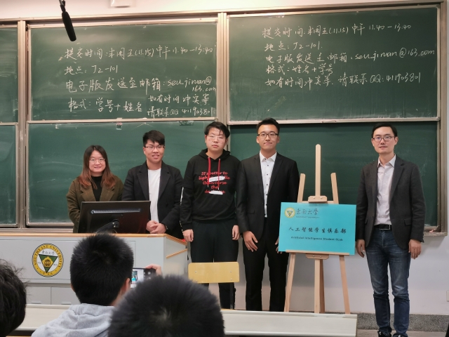 讲座结束后,院团委书记魏敏娜老师主持了人工智能学生俱乐部揭牌成立仪式。首任主席,曾任院团委学生副书记,现为金牌影院 PALM实验室研一学生的杨浩同学上台向大家简单介绍了俱乐部的具体情况。