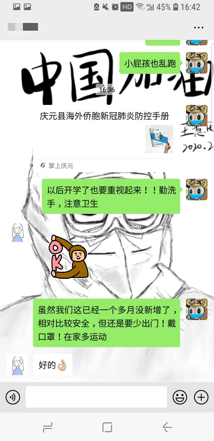 我所在的城市虽已经一个多月无新增病例,且有许多市民开始私下聚集(令人头大),但近期邻县丽水青田有许多侨胞回国,境外输入病例增加,随着小城开始复工,身边不免有许多亲戚、朋友需要出入县城,希望我的一些转发疫情防控知识、健康生活方式的宣传普及与劝诫能让身边人提高防控意识![]()