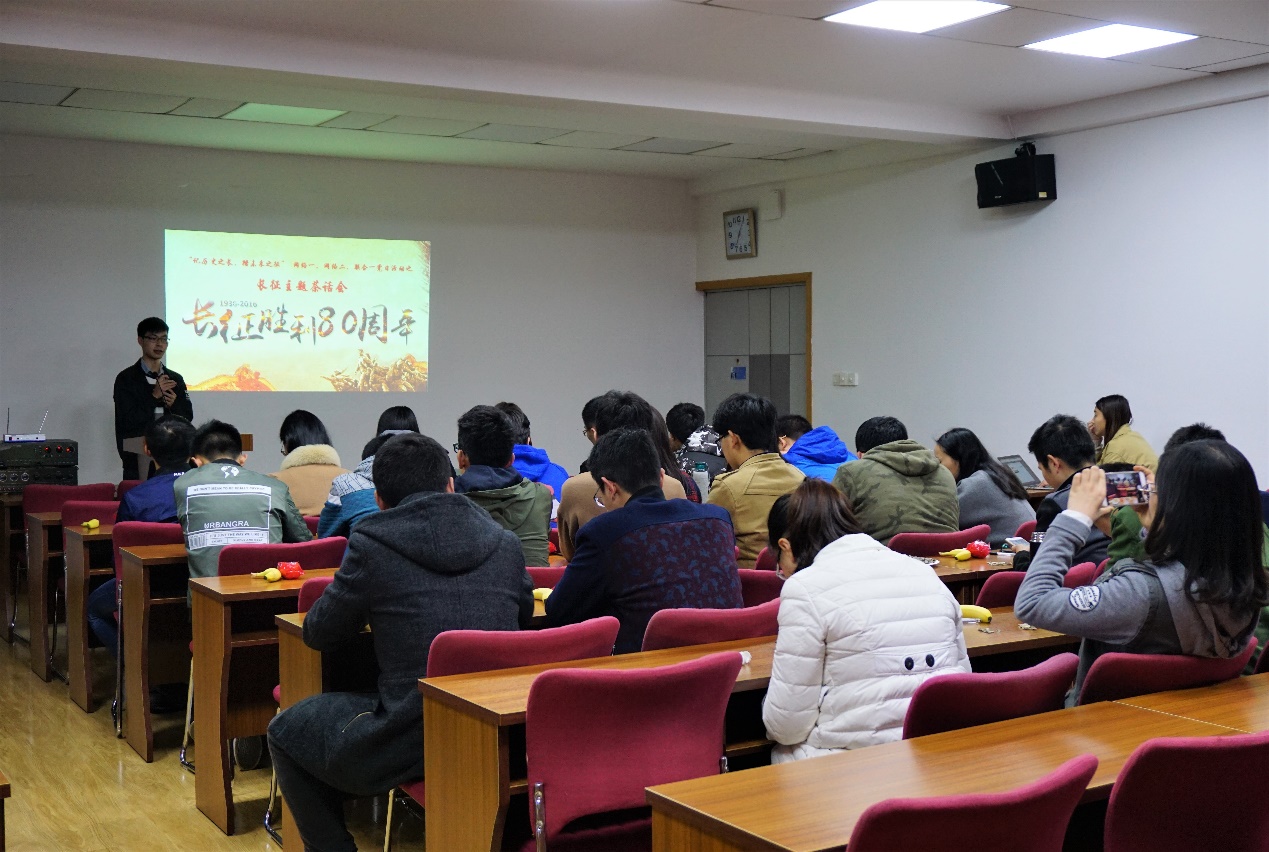 忆起长征,许多人的脑海中多会浮现出雪山、草地、坚韧、奇迹这些词语,长征正是一座丰碑,屹立在中华民族的伟大史册中,成为中国人民奋发图强的精神支柱。何为长征精神?或许就是在面对冰封的皑皑雪山、人迹罕至的茫茫草地、峡谷激流、乌江天险、弯弯赤水、大渡激流时的无所畏惧,或许就是在敌军百万大军的围追堵截、粮食短缺等重重困难时的坚强不屈。在80年后的今天,我们生活富足,社会和平安定,更加不能忘记革命先烈所做出的努力,为了让支部成员回首长征铭记历史,在2017年3月30日,在金牌影院 会议室,我们举办了一场长征主题茶话会。