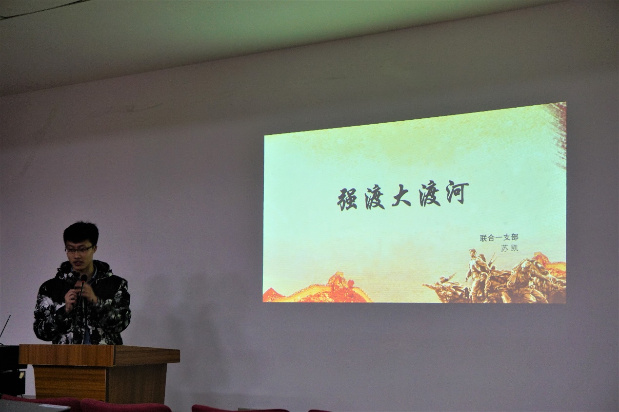 在本次茶话会上,首先由来自联合一支部的苏凯同学和邢超同学分别讲述长征过程中的经典战役“强渡大渡河”、“巧渡金沙江”。两位同学查阅了丰富的资料,从学术论文到纪实影片各个方面为大家讲述了“强渡大渡河”的“强”在哪里,“巧渡金沙江”又“巧”在哪里,让支部成员对这两场战役有了重新的认识。