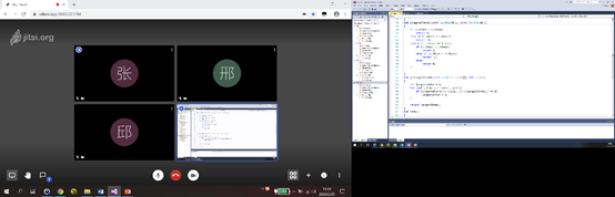 图:系统界面展示-左侧为Web形式的视频会议系统界面,右侧为共享给学生的VS开发环境