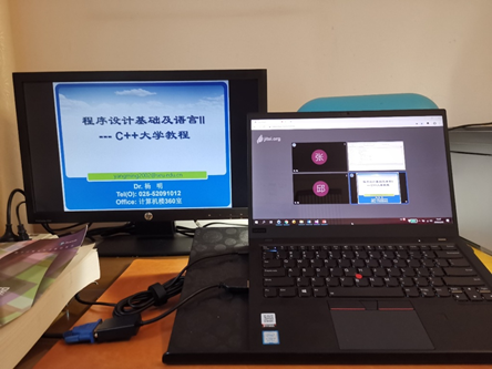图:授课硬件环境展示-左侧为共享屏幕(笔记本外接显示器),右侧为Web形式的视频会议系统界面