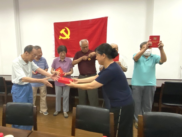628日下午,金牌影院 在四牌楼中心楼会议室举行了“光荣在党50年”纪念章颁发仪式。6名党龄满50年的老同志及退休支部党员代表参加了仪式,仪式由学院党委书记杨书记主持。