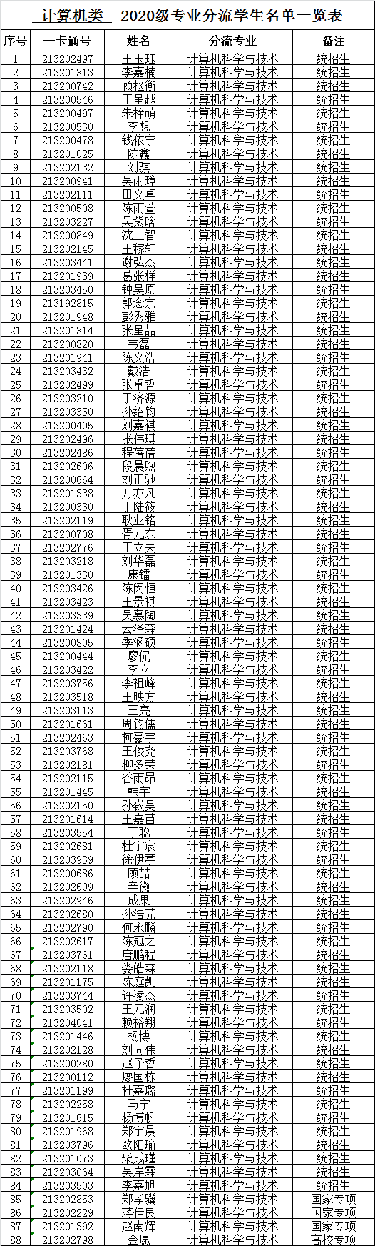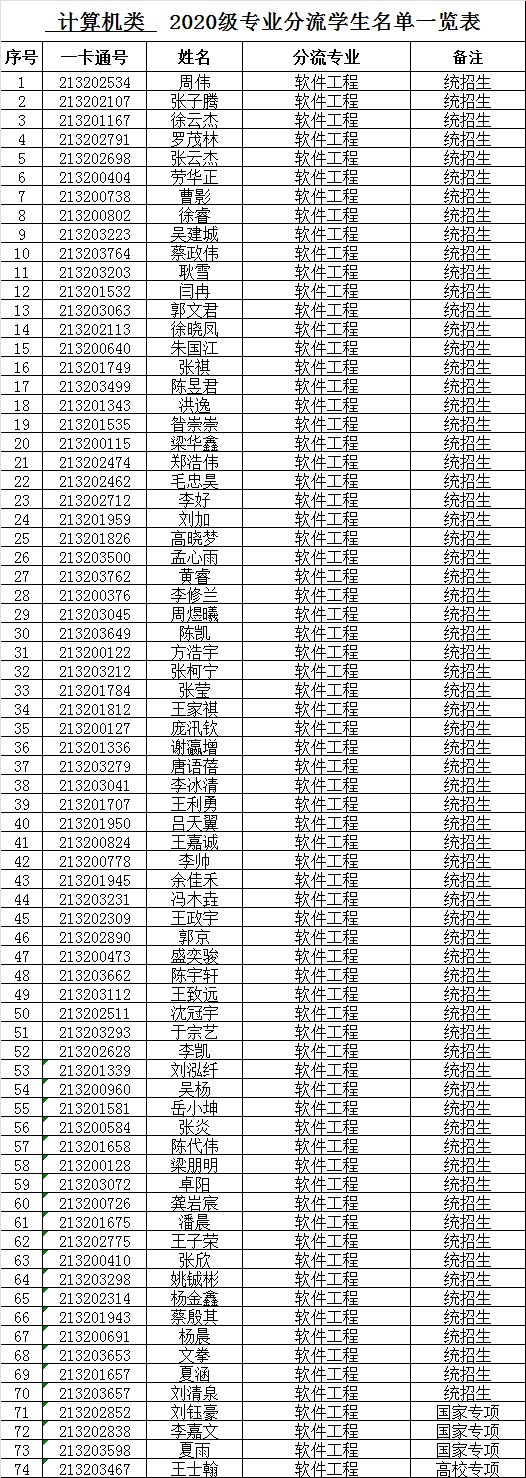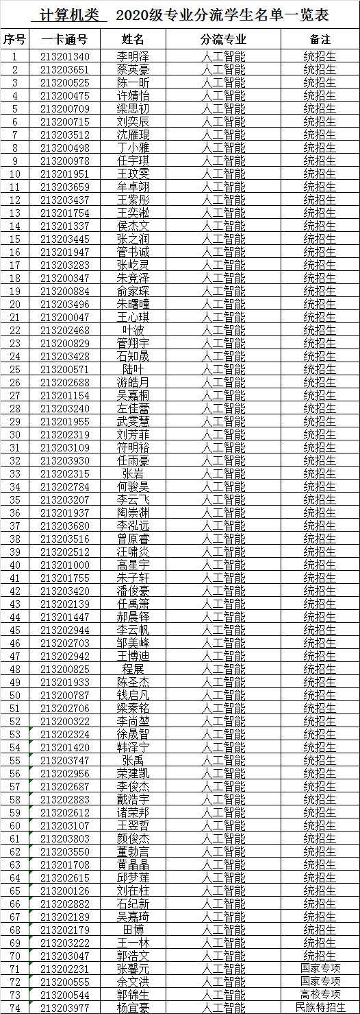 根据学校《关于2020 级部分本科生专业分流工作安排的通知》(校机教〔2021〕75号)文件精神,根据学生填报志愿,按照计算机类分流方案,确定各专业学生名单。现对计算机类各专业分流名单进行公示。