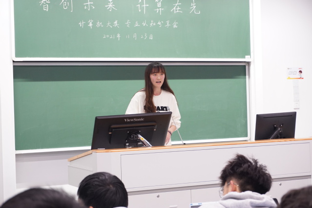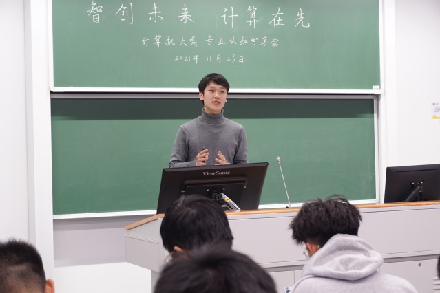 首先是计算机科学与技术专业的优秀学长代表殷春锁同学带来的专业认知分享。他首先进行了专业总体介绍,总结了计算机科学与技术专业的专业特点与能力要求;接着他以公共必修课程为线索向大家分享了各门课程特点与基本学习方法;在第三部分,他进一步介绍了计算机科学与技术专业的主干课程与选修课程;最后,他向大家讲述了一些面对专业分流选择的个人感想,并对大一的学弟学妹们提出了建议与祝福。