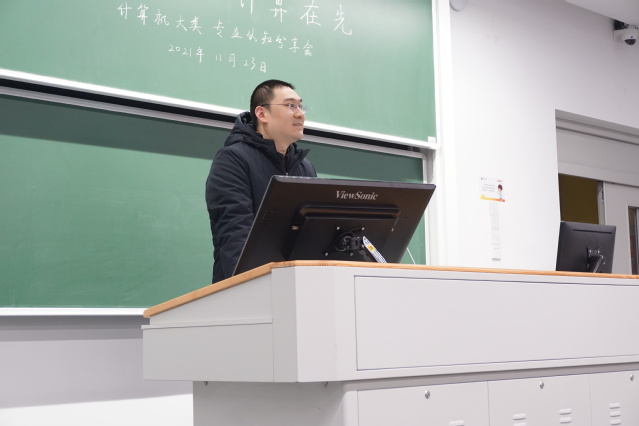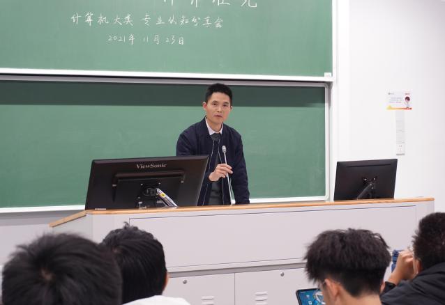 三位学长学姐代表的专业认知分享结束后,智能系统与应用方向的教师代表倪庆剑老师向大家分享了计算机类的学习、科研和工程方面的建议。他首先进行了计算机类的相关介绍、大学学习任务与目标的明确;然后他从不同阶段的学习规划、进行科研与工程时的资料查询管理等方面对大一学生做出了详细具体的学习生涯指导。最后,他鼓励大家向学院的人才培养目标更进一步。