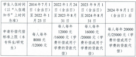 根据《财政部 教育部 中国人民银行 金融监管总局关于调整完善国家助学贷款有关政策的通知》(财教〔2024〕188号)规定,自2024年秋季学期起,服兵役资助学费补偿、用于学费的国家助学贷款和学费减免标准调整为本专科学生每人每年最高不超过20000元、研究生每人每年最高不超过25000元。近年不同时间入伍的学生,适用的学费补偿或贷款代偿申请标准如下: